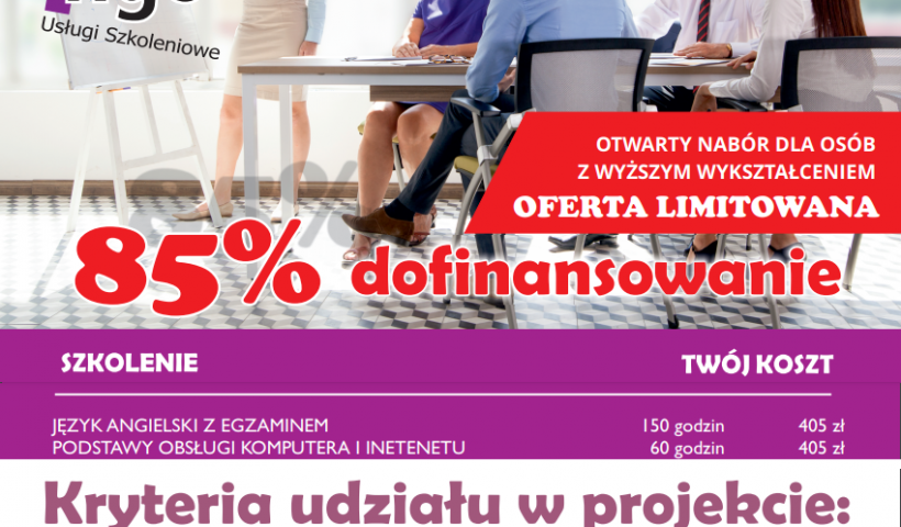 Szanowni Państwo zapraszamy do zapoznania się z ofertą szkoleń dofinansowanych 85% z funduszy Unii Europejskiej- KIERUNEK KARIERA kursy języka angielskiego kursy komputerowe Rusza pierwsza edycja…