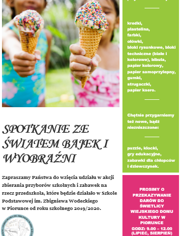 Szkolne Koło Wolontariatu-Liderzy zachęca wszystkich uczniów oraz mieszkańców Piorunki i Czyrnej do wzięcia udziału w akcji „Spotkanie ze Światem Bajek i Wyobraźni”. Celem przedsięwzięcia jest…
